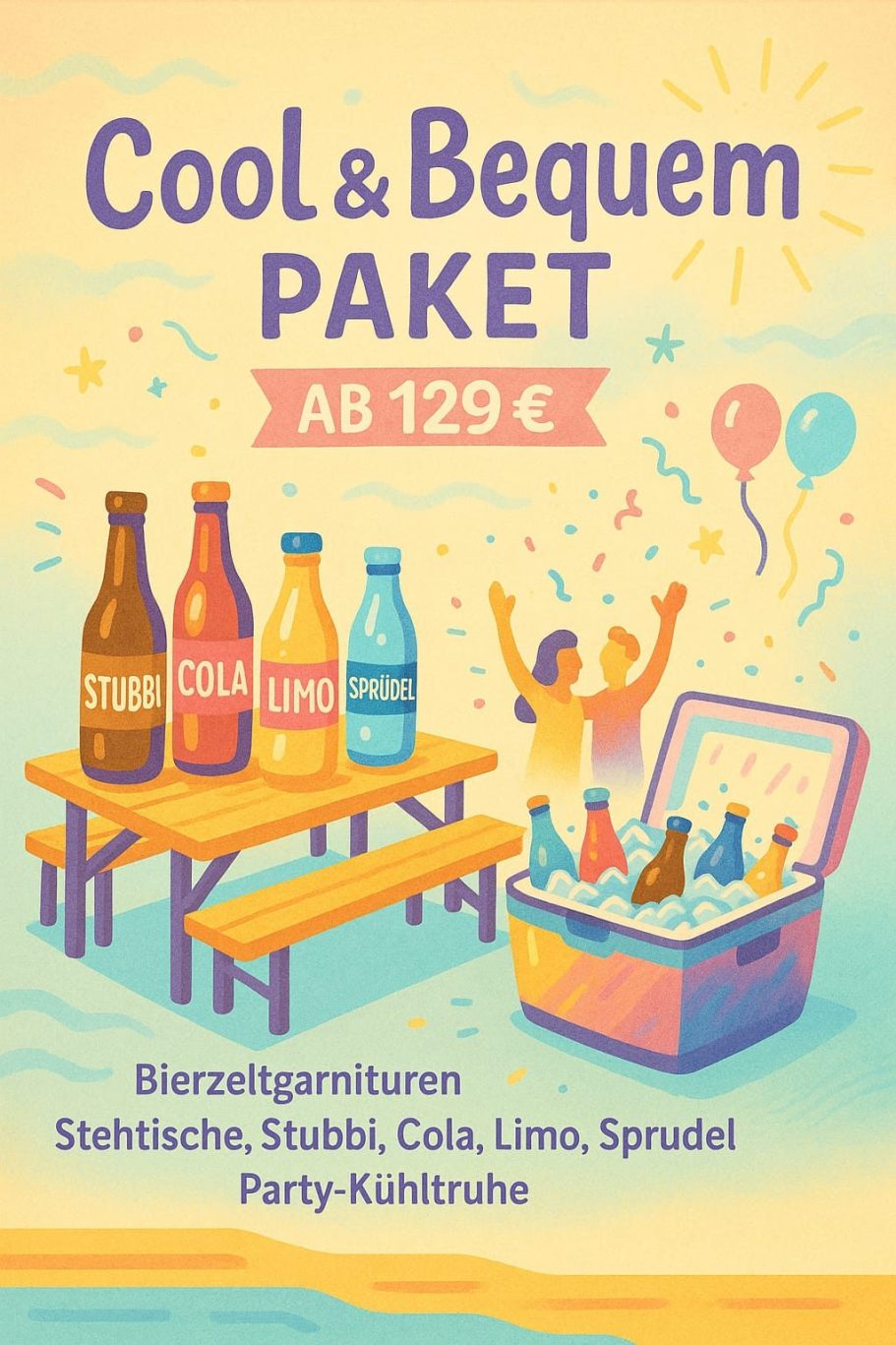 Inkl. Bierzeltgarnituren, Stehtische, Stubbi, Cola, Limo, Sprudel, Kühltruhe