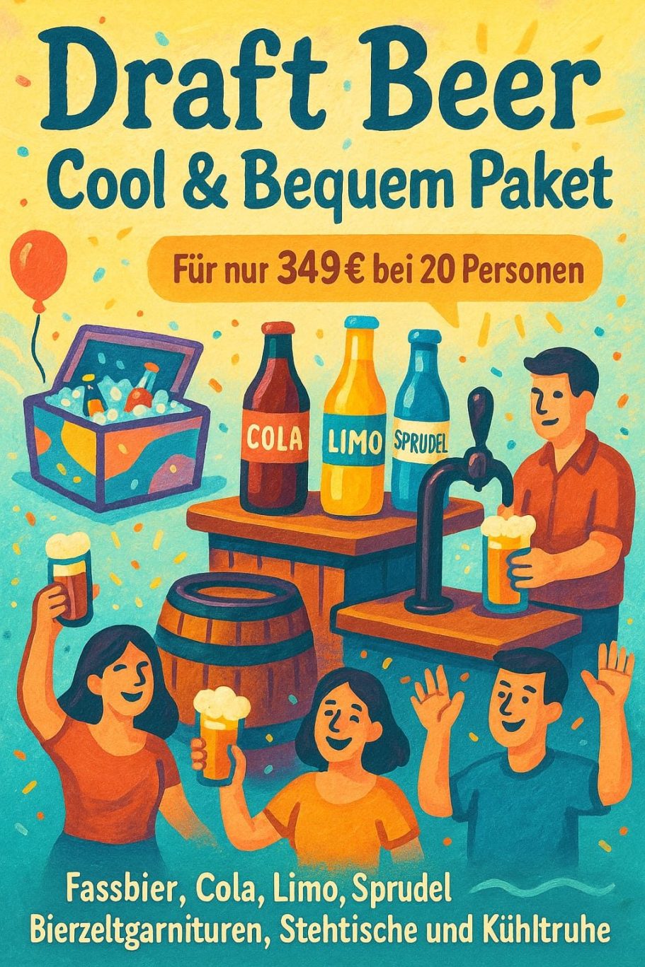 Inkl. Bierzeltgarnituren, Stehtische, Fassbier, Zapfanlage, Schläuche, Cola, Limo, Sprudel, Kühltruhe